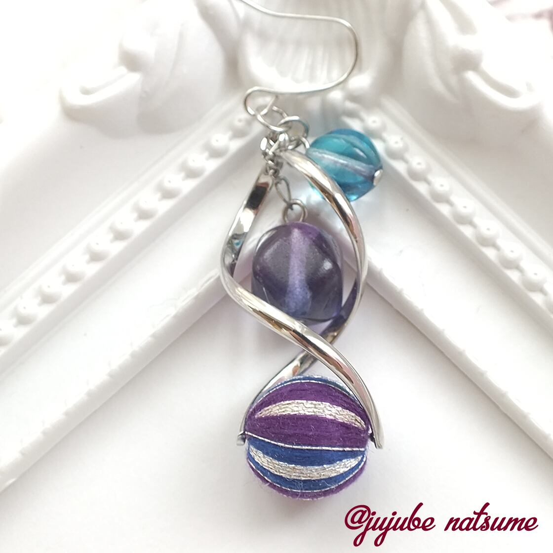 耳元で螺旋と銀色ベースの巻き玉が光ります